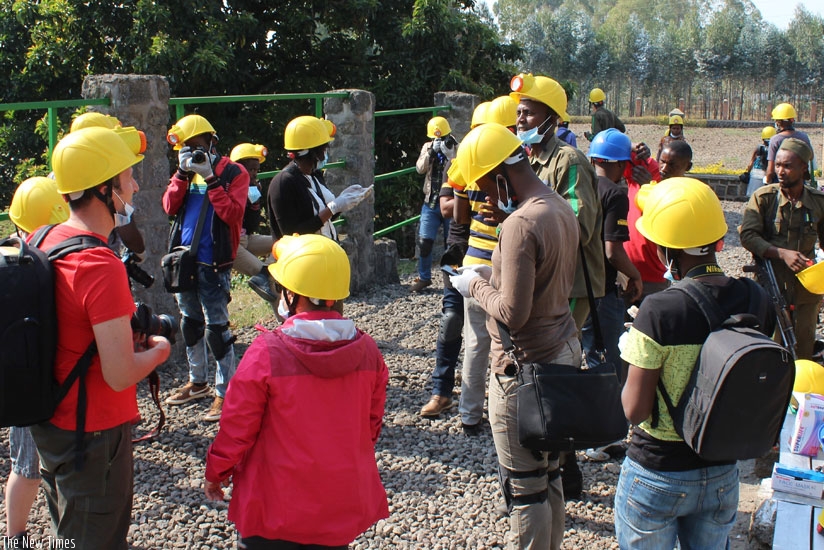 Journalists wear protective gear before entering Musanze caves. / Allan Brian Ssenyonga