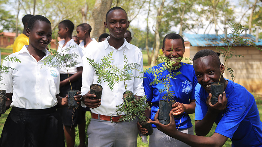 Students hold seedlings before planting them at Groupe Scolaire Musenyi in Kayonza District, Eastern Province. Sam Ngendahimana.