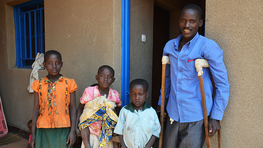 Antoine Mukeshimana poses with his children in front of his house in Rweru model village. Sam Ngendahimana.