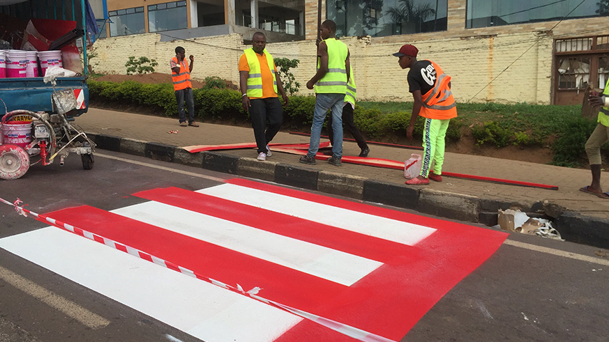 New Zebra crossing marks being established along airport road in Kigali. Government is set to table a new law before parliament which will ensure motorists respect more such traffic signs among other road rules. Athan Tashobya.