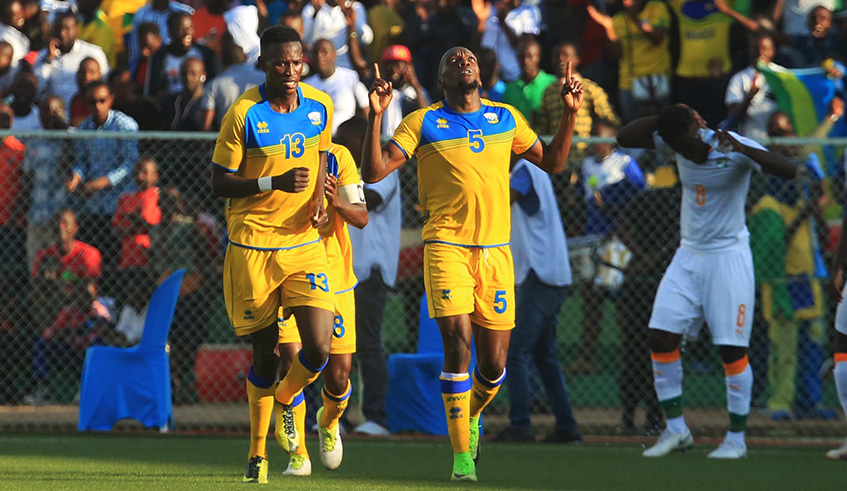Striker Meddie Kagere celebrates his goal during the AFCON 2019 qualifier against Ivory Coast at Kigali Stadium  on September 9. Sam Ngendahimana.