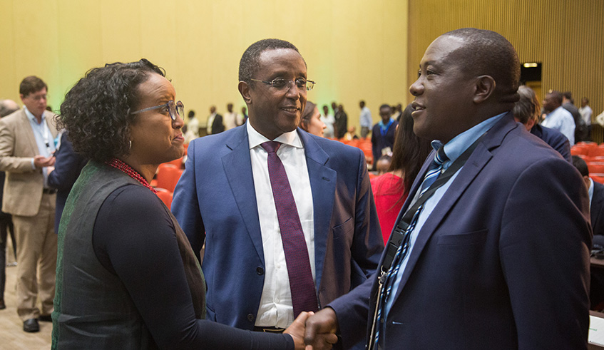 Ayaan Adam, Director of Private Sector Facility at the Green Climate Fund (left), shakes hands with Jean Marie Vianney Gatabazi, Governor of Northern Province, while the Minister for Environment, Dr Vincent Biruta, looks on Day II of the ongoing Africa Green Growth Forum at Kigali Convention Centre yesterday. The Government has been urged to place more emphasis on green growth even as the country consolidates its position as a top business friendly destination. Nadege Imbabazi.