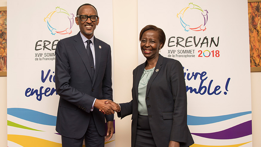 President Kagame congratulates Mushikiwabo after she was elected to the helm of the 84-nation bloc took place on Friday during the 17th OIF summit in Yerevan. (Village Urugwiro)