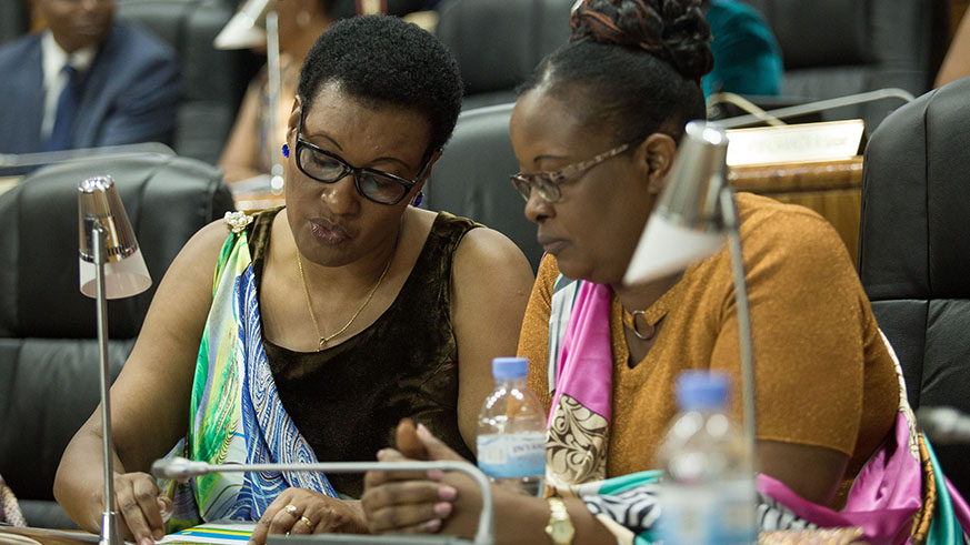 Speaker of the Lower House Donatille Mukabalisa (left) chats with Vice Speaker Edda Mukabagwiza before the swearing-in ceremony yesterday. Nadege Imbabazi.