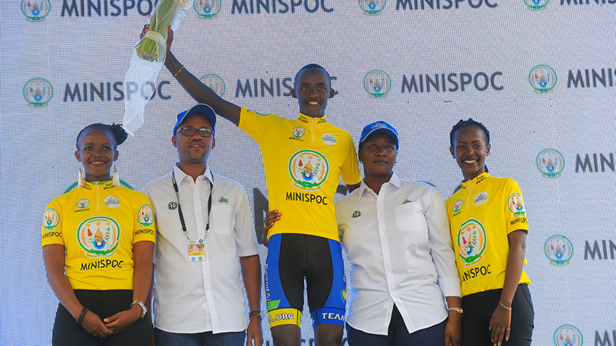 Minister for Sports and Culture, Julienne Uwacu, and FERWACY president Aimable Bayingana, pose with Team Rwanda captain Samuel Mugisha as he retains yellow jersey in the ongoing Tour du Rwanda which ends with a circuit around Kigali today. The race will be concluded from Kigali Stadium in Nyamirambo.