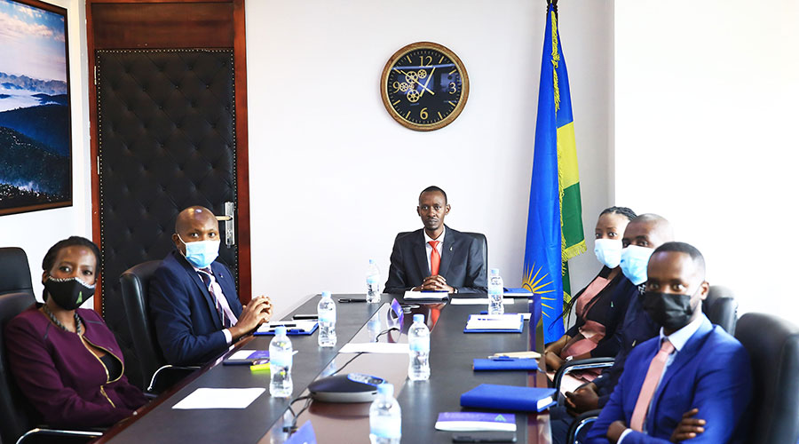 Nick Barigye, the Chief Executive of Rwanda Finance Limited (centre), and staff of the agency during the signing of a partnership framework with Belgian Finance Centre in Kigali on Wednesday, February 24.