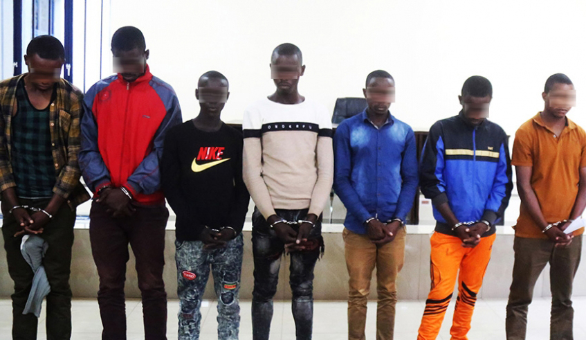 Suspects in a mobile money scam at RIB Headquarters in February last year. Some 141 cyber fraud cases were reported between January and September 2020 involving Rwf371 million. / Sam Ngendahimana