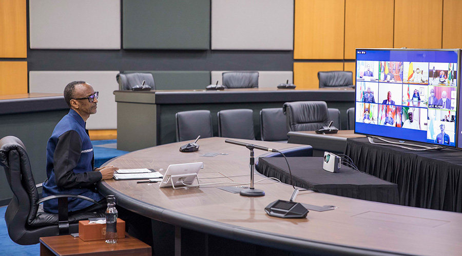President Kagame addressing fellow leaders at the 17th Conference of the ECCAS Heads of State Summit. Held virtually, the summit was taking place for the first time since the body adopted its institutional reforms last year.