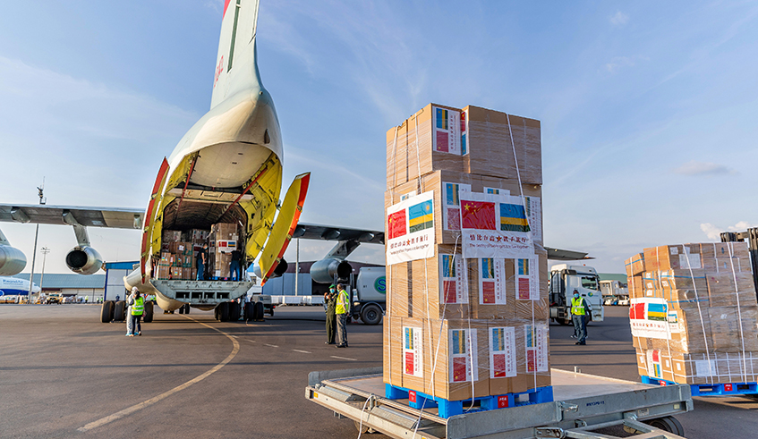 A consignment of personal protective equipment donated by Chinau2019s Peopleu2019s Liberation Army is offloaded at Kigali International Airport on June 3. / Photos: Courtesy.