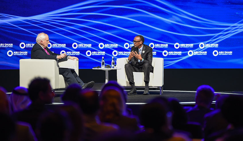 President Kagame during a Presidential Keynote Interview of the Future Sustainability Summit conducted by British broadcast journalist Nik Gowing, in Abu Dhabi yesterday. During the interaction, they discussed Rwandau2019s Sustainability Development Goals. The interview was held as part of Abu Dhabi Sustainability Week, which started on Monday.