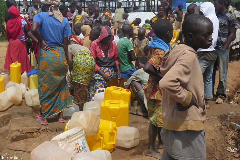 Burundian refugees waiting in a queue to fetch water in Mahama Camp. (Timothy Kisambira)