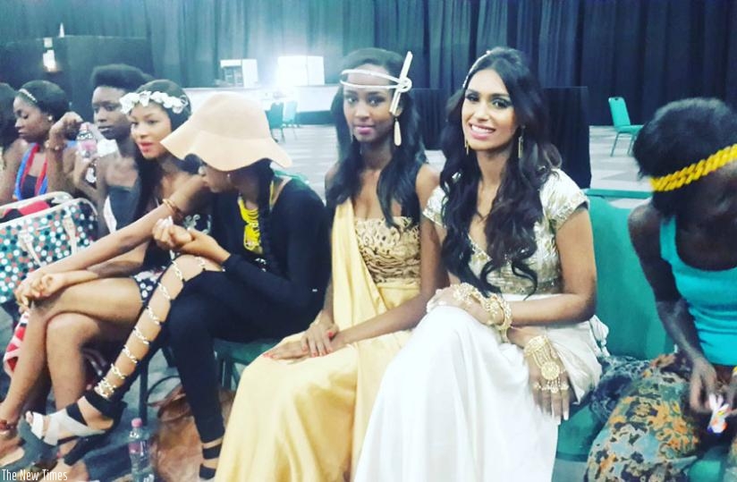 She dons Rwanda's traditional dress, the umushanana back stage.