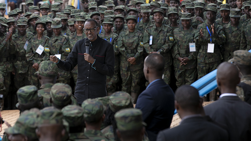 President Kagame speaks at the closure of the eleventh edition of Itorero Indangamirwa at the Gabiro Combat Training Centre in Gatsibo District, Eastern Province yesterday. Village Urugwiro.