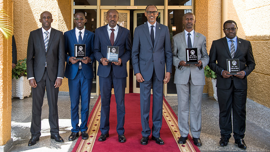 President Kagame poses for a group photo with the mayors whose districts scored highly in the implementation of Imihigo for the financial year 2017/18, namely; Radjab Mbonyumuvunyi of Rwamagana (best performing district, 3rd left); Stephen Rwamurangwa of Gasabo (first runner-up, 2nd right); Emmanuel Kayiranga of Rulindo (second runner-up, 2nd right) and Deogratias Nzamwita of Gakenke (third runner-up, right). Left is Local Government minister Francis Kaboneka.  Village Urugwiro