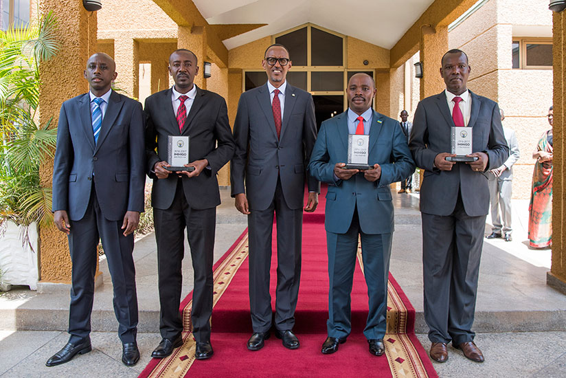 President Kagame in a photo with the mayors of top performing districts in the 2016/17 Imihigo; Radjab Mbonyumuvunyi, of Rwamagana (2nd L); Jean-Damascene Habyarimana, of Musanze (....