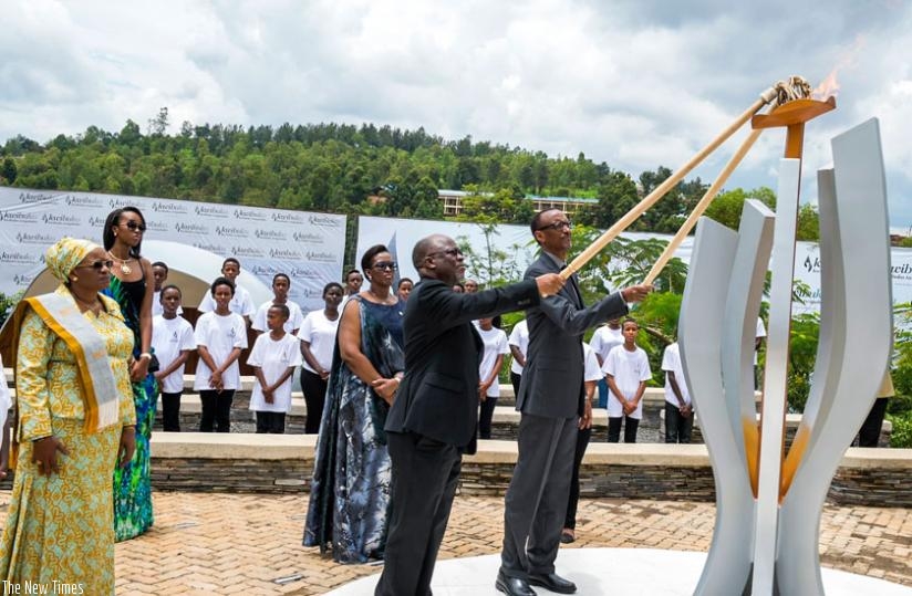 Presidents Kagame and Magufuli light the Flame of Remembrance at the Kigali Genocide Memorial Centre to mark the beginning of the 22nd commemoration of the 1994 Genocide against th....