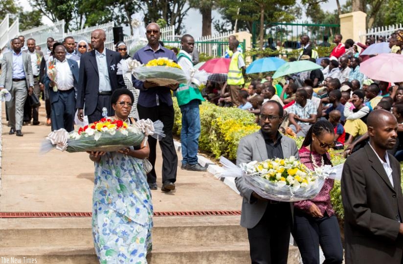 Christine Mukabunane, the spokesperson of the National Forum for Political Organisations, lays a wreath at Rebero Memorial site in Kicukiro District yesterday to pay tribute to pol....