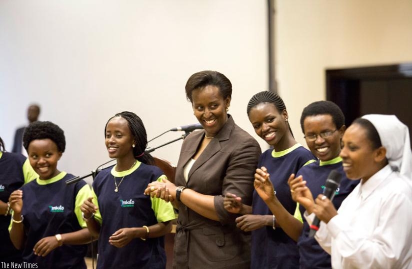 First Lady Jeannette Kagame joins mentees for a song and dance led by Soeur Immaculee Uwamaliya, of Rwamagana School of Nursing and Midwifery (R). (Courtesy)