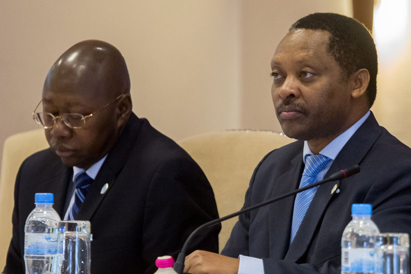UN Resident Coordinator Lamin M. Manneh (L) and Prof. Anastase Shyaka, the chief executive of Rwanda Governance Board, at an event to mark the International Press Freedom Day in Ki....