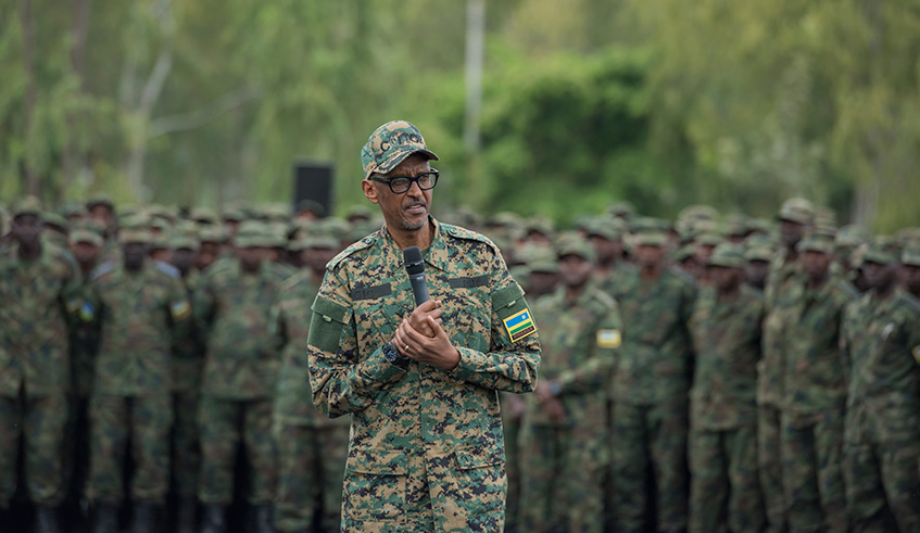 President Kagame addresses the troops during the RDF Combined Arms Field Training Exercise at the Rwanda Defence Forces Combat Training Centre in Gabiro, Eastern Province, yesterday. Village Urugwiro.