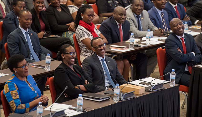 President Kagame and First Lady Jeannette Kagame, as well as Speaker of the Chamber of Deputies Donatille Mukabalisa (left) and Prime Minister u00c9douard Ngirente (far right) and other officials and delegates on the last day of the 16th National Umushyikirano Council at Kigali Convention Centre yesterday. Village Urugwiro.