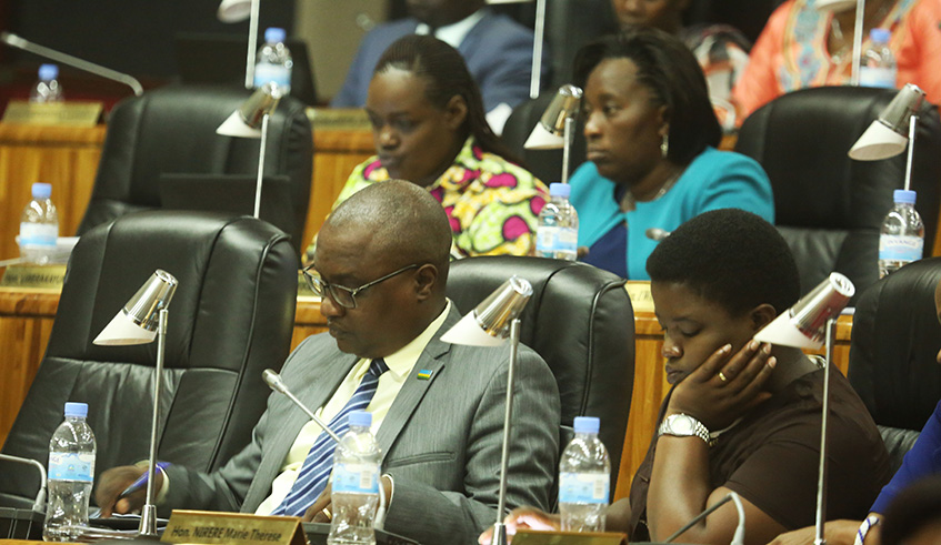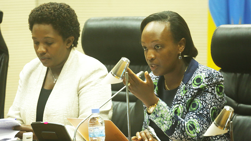 Nadine Umutoni Gatsinzi, the Permanent Secretary in the Ministry of Gender and Family Promotion (right), addresses members of parliament as MP Odette Uwamariya looks on yesterday. Parliamentarians were urged to increase their awareness campaigns across the country to ensure that citizens understand the role of gender equality in fast-tracking national development. Sam Ngendahimana.