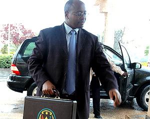 Finance Minister James Musoni arrives at Parliament to present the 2008 Budget estimates yesterday. (Photo/ G Barya)