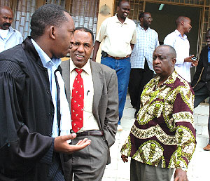NO WAY OUT: Counsel Mbonyimbuga speaks to his clients former MPs Ngirabakunzi (centre) and Murashi at the Supreme Court, Kimihurura, yesterday. (Photo/ G.Barya)