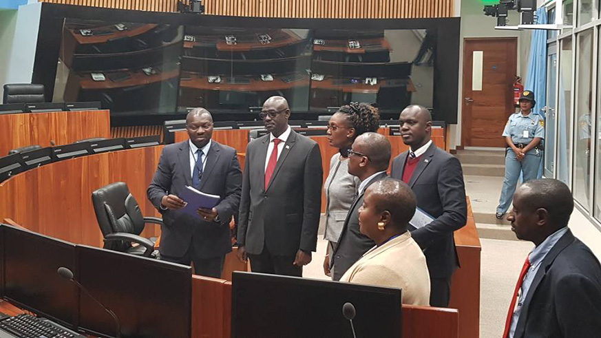 Justice Minister and Attorney General Johnston Busingye (2nd left) and his delegation are shown around one of the courtrooms of the former International Criminal Tribunal for Rwanda during his visit to the court last week. Courtesy