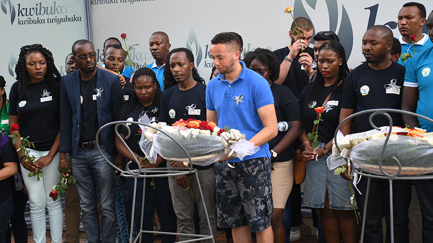 Daniel Adugna, African Union Youth Volunteers programme Coordinator, laying wreath on the graves.Frederic Byumvuhore