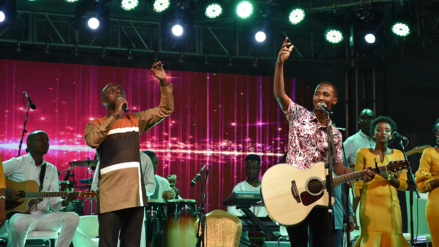 Aimu00e9 Uwimana (left), and Israel Mbonyi. Photo by Frederic Byumvuhore