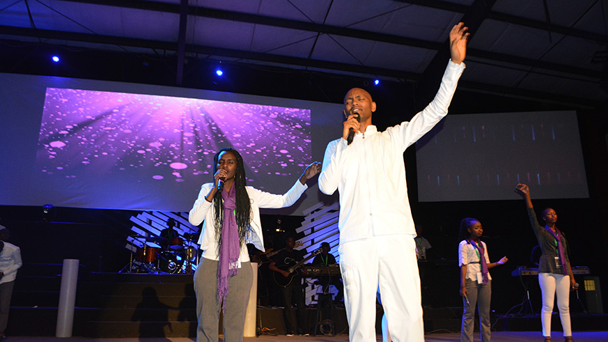 People raise their hands in worship during the u2018Ibyo Ntunzeu2019 concert at Kigali Serena Hotel on Sunday.  Frederic Byumvuhore.