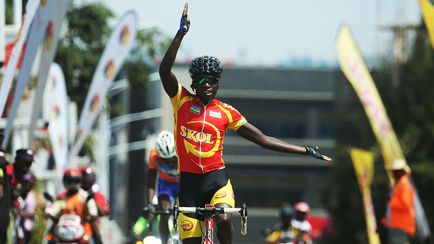 Jean Claude Uwizeye celebrates his solo finish after crossing the finish-line on Saturday afternoon.