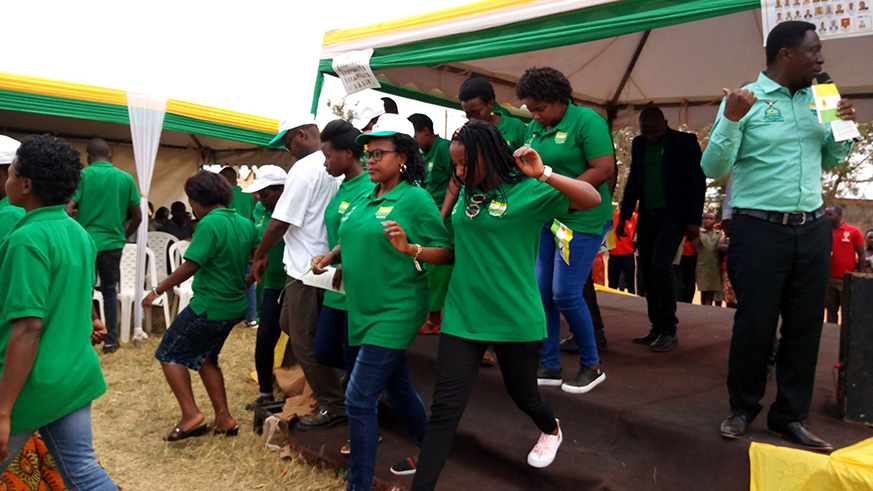 Green Partyu2019s Frank Habineza dances with party members in Gahanga, Kicukiro District on Monday. Jean du2019Amour Mbonyinshuti.
