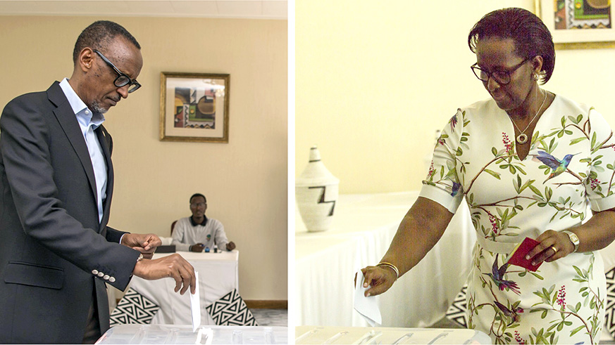 President Kagame and First Lady Jeannette Kagame cast their vote in legislative elections at the Rwandan Embassy in China, yesterday. About 46,000 Rwandans in Diaspora were expected to cast their ballots yesterday, while over 7 million are expected to take part in the direct poll in Rwanda today. Village Urugwiro.