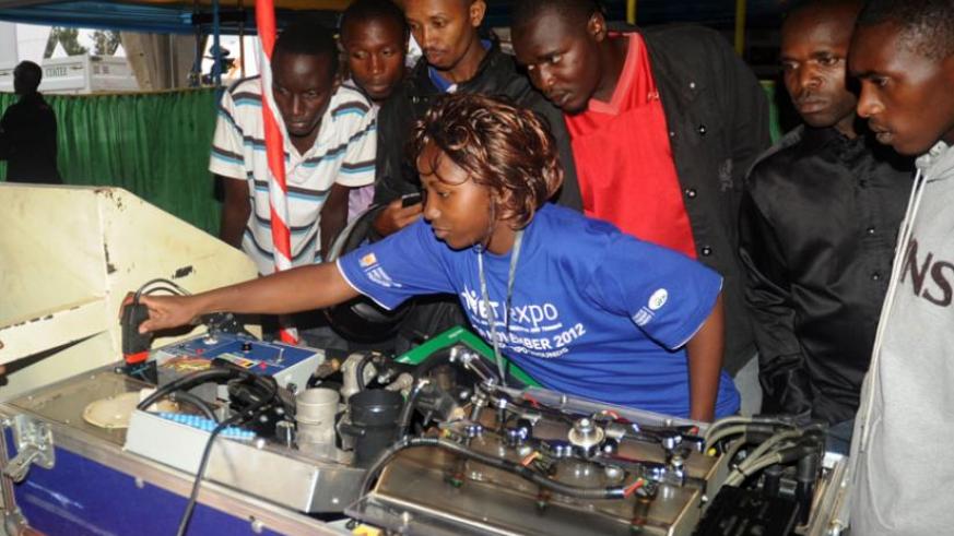 A student of mechanical engineering explains how an engine works during a TVET expo in Kigali. File.