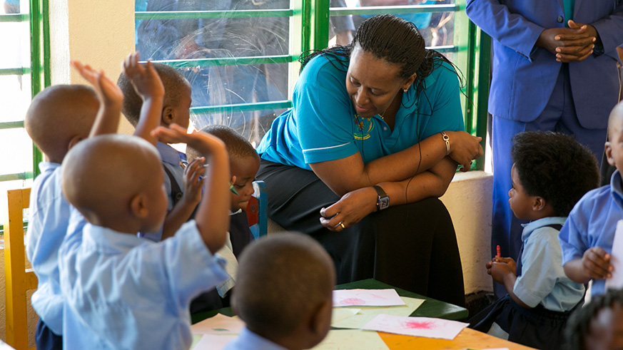 First Lady, Jeannette Kagame interacts with children from ECD Nemba during celebration of the International Day of the African child in Gakenke District yesterday. Courtesy.