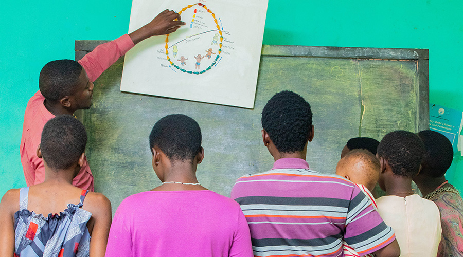 Teenage mothers at Centre Marembo in Gasabo District being taken through the reproductive cycle by a health worker at the centre. The centre has been helping vulnerable teen mothers. / Emmanuel Kwizera