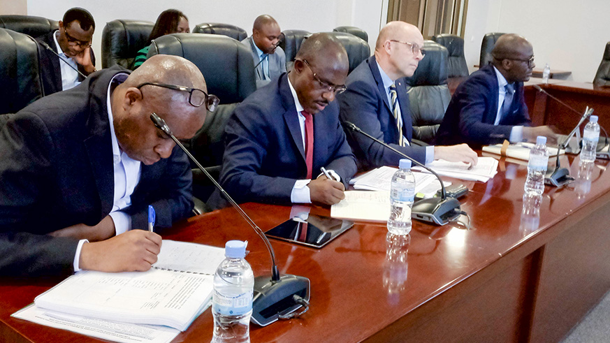 Minister for Education Eugene Mutimura (second left) and other officials appear before the parliamentary Public Accounts Committee yesterday. The officials have been faulted by parliament for failure to promote ICT in schools, especially given the low levels of internet penetration in schools, which, according to lawmakers, makes the learning process hard. Jean du2019Amour Mbonyinshuti.