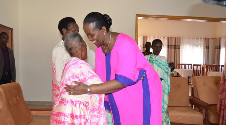 First Lady greeting an elder survivor during the inauguration of Impinganzima houses.
