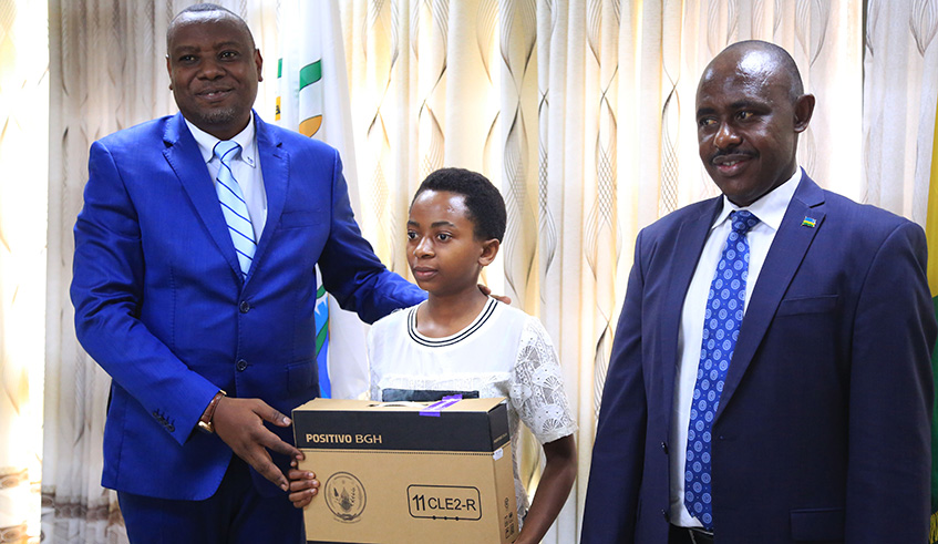 Minister of Education Eugene Mutimura (right) and the State Minister for Primary and Secondary Education Isaac Munyakazi award College Christ Roi's Viollette Tuyishime (center)  who emerged best performer in languages (Photos by Sam Ngendahima)