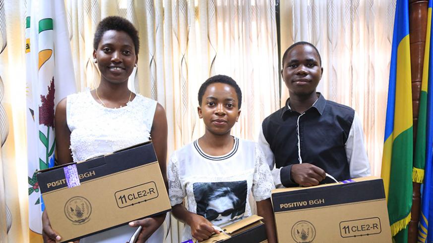 (L-R) Best performers in senior six national exams Pax Agrippine Nubuhoro from ISF Nyamasheke, Violette Tuyishime College du Christ Roi, and Thomas Havugimana from TTC Nyamata. / Sam Ngendahimana