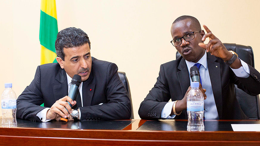 The Attorney General of Qatar, Ali Bin Fatais Al Marri (left), and the State minister for Constitutional and Legal Affairs, Evode Uwizeyimana, on Sunday. Al Marri, hailed Rwandau2019s recovery and gains in the judicial sector, 25 years after the 1994 Genocide against the Tutsi. Emmanuel Kwizera.