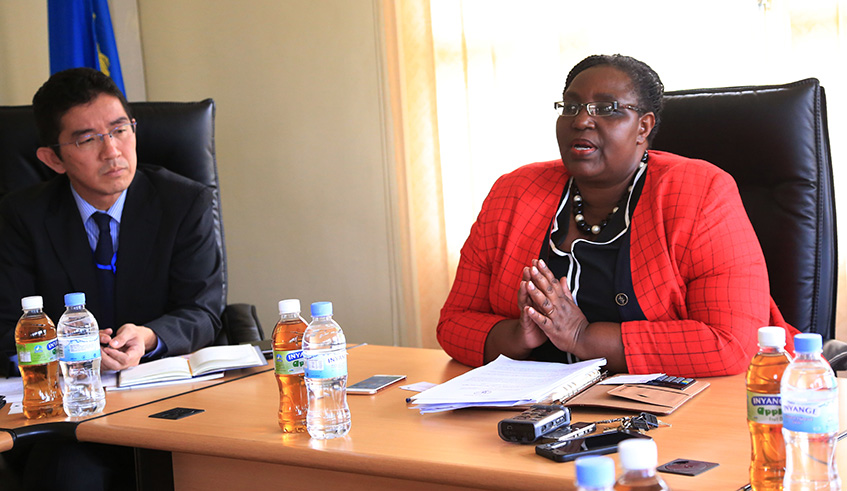 Mukantabana speaks during the news briefing as Maruo Shin, the chief representative of JICA Rwanda office looks on on Monday. Sam Ngendahimana.