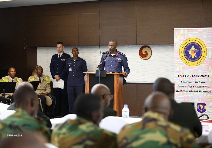 Maj. Gen Charles Karamba speaks to participants during the opening ceremony.
