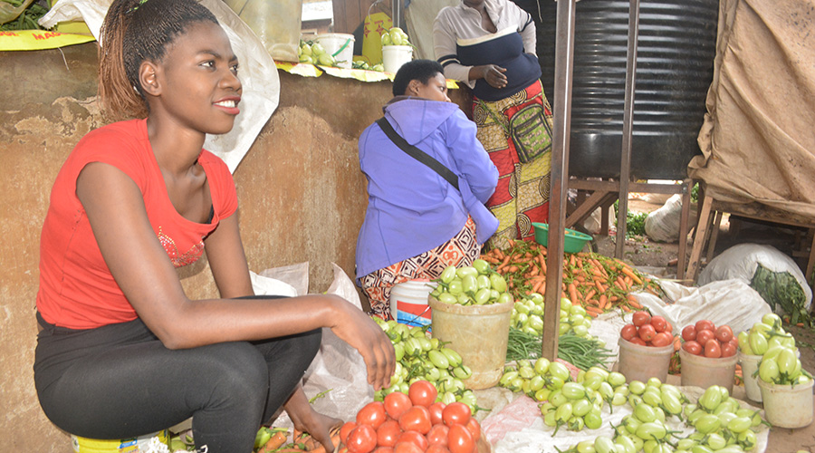 Gisele Ingabire in her stand where she sells vegetables in Kabuga. / Jean d'Amour Mbonyinshuti