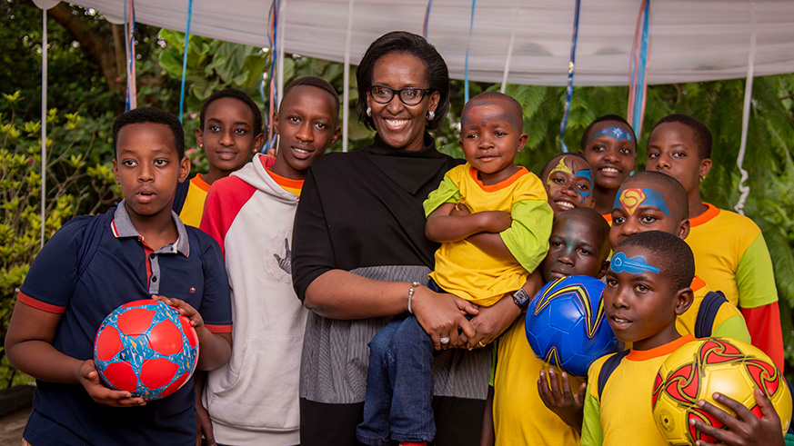 First Lady Jeannette Kagame posing for pictures with some of the children at the end of year party. Village Urugwiro.