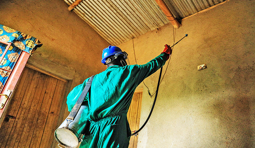 A health worker conducts an indoor residual spraying in Bugesera District. / Photo: Dan Nsengiyumva.