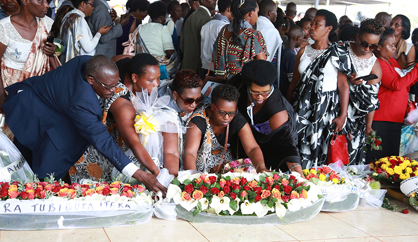 Survivors lay wreaths on a grave during the decent burial of Genocide victims at Nyanza Genocide memorial, on May 4, 2019.