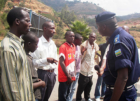 Police Spokesman, Eric Kayiranga speaking to parents of the repatriated children at Akanyaru (Photo; P. Ntambara)